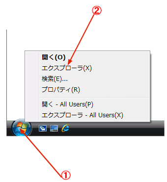 @ [スタート]ボタンを右クリックする。 A [エクスプローラ]をクリックする。
